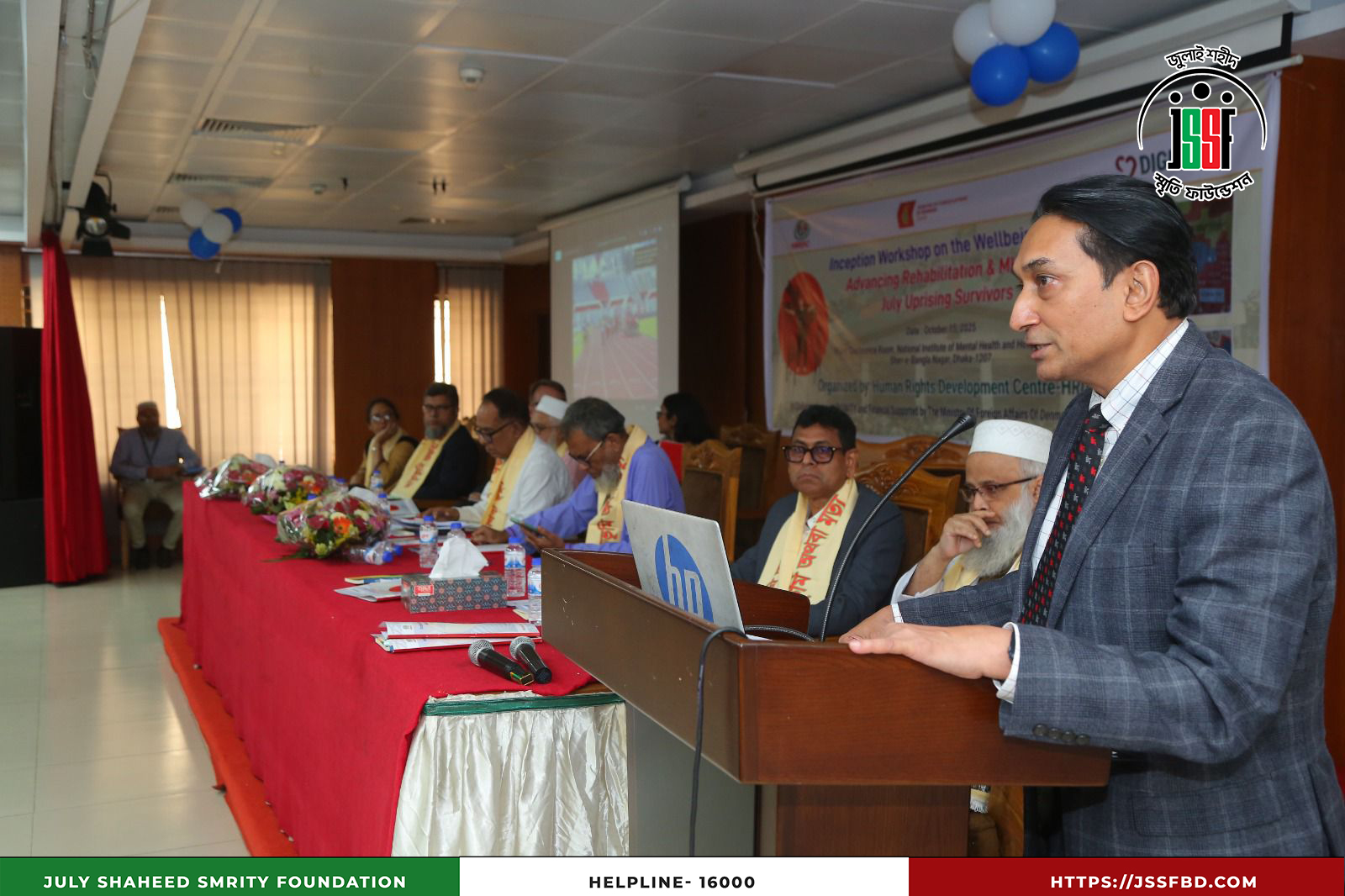 The Human Rights Development Centre (HRDC), in collaboration with DIGNITY – Danish Institute Against Torture and with support from the Ministry of Foreign Affairs of Denmark (DANIDA), organized the Inception Workshop of the Wellbeing Project at the National Institute of Mental Health and Hospital (NIMH), Dhaka. The event, attended by dignitaries including Md. Saidur Rahman, Secretary, Ministry of Health and Family Welfare; Anders Karlsen, Deputy Head of Mission, Embassy of Denmark; Prof. Dr. Md. Mahbubur Rahman, Director of NIMH; Md. Mahbul Haque, Secretary General & CEO of HRDC; Kamal Akbar, CEO of July Shaheed Smrity Foundation; Shamsi Ara Zaman, General Secretary of July Shaheed Smrity Foundation; and employees of the Foundation, aimed to promote rehabilitation and Mental Health and Psychosocial Support Services (MHPSS) for survivors of the July 2024 Uprising and their families. The workshop reaffirmed a shared commitment to healing, inclusion, and dignity for all survivors.