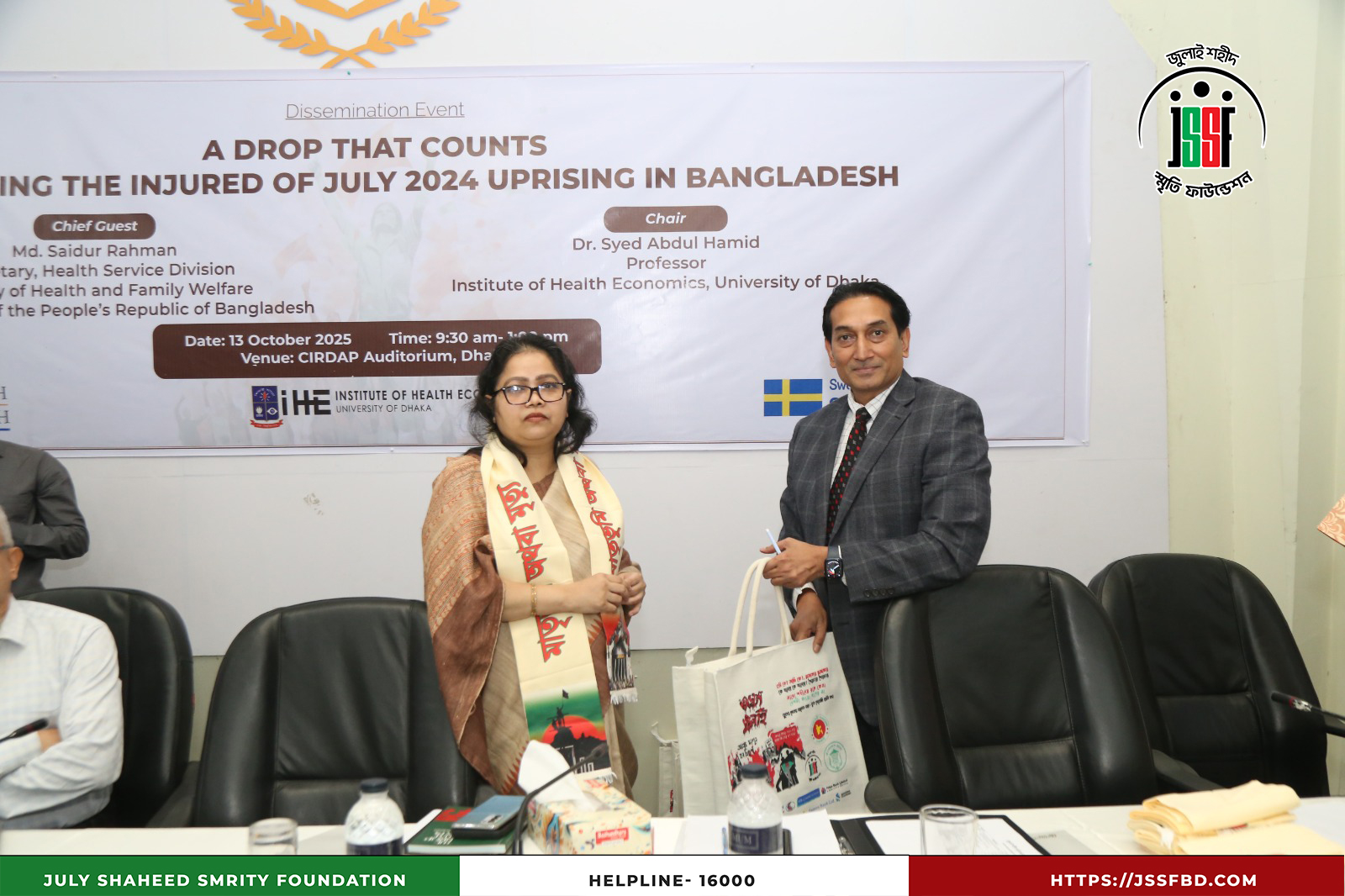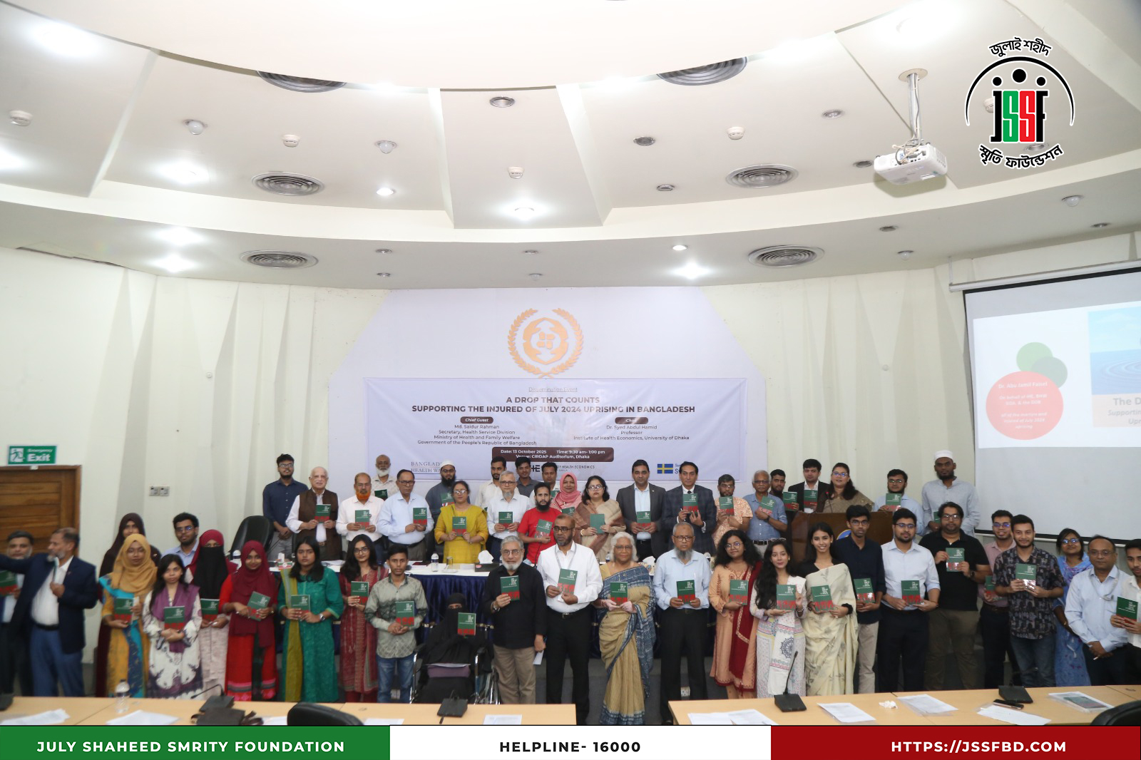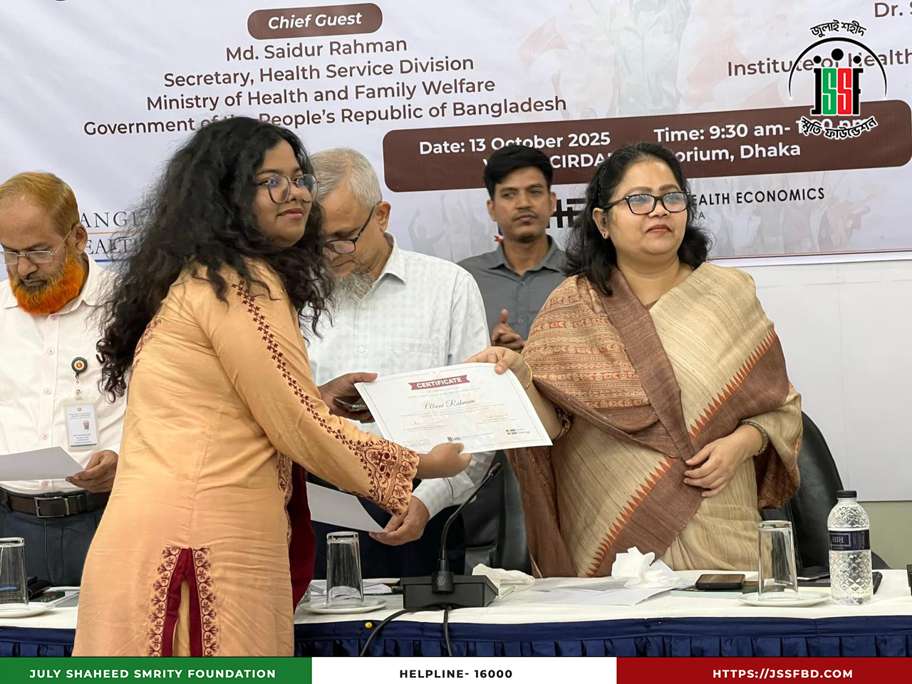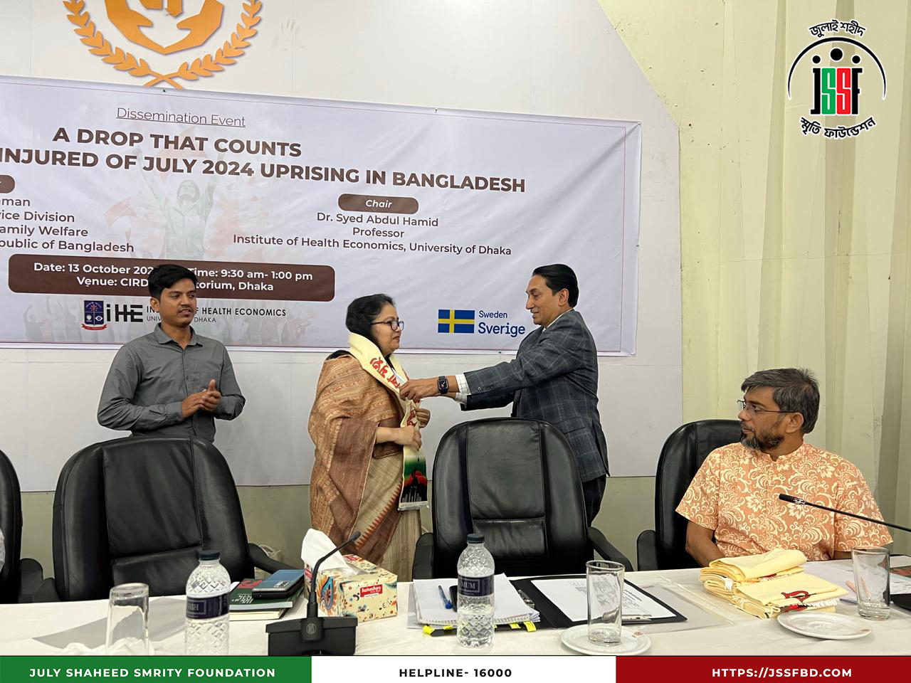 ঢাকা বিশ্ববিদ্যালয়ের ইনস্টিটিউট অব হেলথ ইকনমিক্স (IHE), বাংলাদেশ হেলথ ওয়াচ এবং সুইডিশ ইন্টারন্যাশনাল ডেভেলপমেন্ট কোঅপারেশন এজেন্সি (SIDA)-এর সহযোগিতায় ২০২৫ সালের ১৩ অক্টোবর ঢাকার সার্ডাপ অডিটোরিয়ামে “বৈষম্যবিরোধী ছাত্র আন্দোলনের আহতদের আর্থিক সহায়তা” শীর্ষক Dissemination Program অনুষ্ঠিত হয়। অনুষ্ঠানে উপস্থিত ছিলেন লেফটেন্যান্ট কর্নেল (অব.) কামাল আকবর, প্রধান নির্বাহী কর্মকর্তা এবং সামসি আরা, সাধারণ সম্পাদক, জুলাই শহীদ স্মৃতি ফাউন্ডেশনসহ বিশিষ্ট শিক্ষক ও অতিথিবৃন্দ। অংশগ্রহণকারীদের মধ্যে ছিলেন ড. সৈয়দ আবদুল হামিদ, ড. শফিউন নাহিন শিমুল, ড. আহমেদ মুশতাক রেজা চৌধুরী, ড. মোহাম্মদ আনোয়ার হোসেন, ড. মোস্তাফিজুর রহমান ও প্রফেসর ড. সায়েমা হক বিদিশা প্রমুখ। অনুষ্ঠানে জুলাই ২০২৪ সালের বৈষম্যবিরোধী ছাত্র আন্দোলনের আহতদের সহায়তা কার্যক্রমের অভিজ্ঞতা ও সাফল্য তুলে ধরা হয়, যা মানবিক সংহতি ও সামাজিক ন্যায়বিচারের প্রতি অঙ্গীকারকে আরও সুদৃঢ় করেছে।