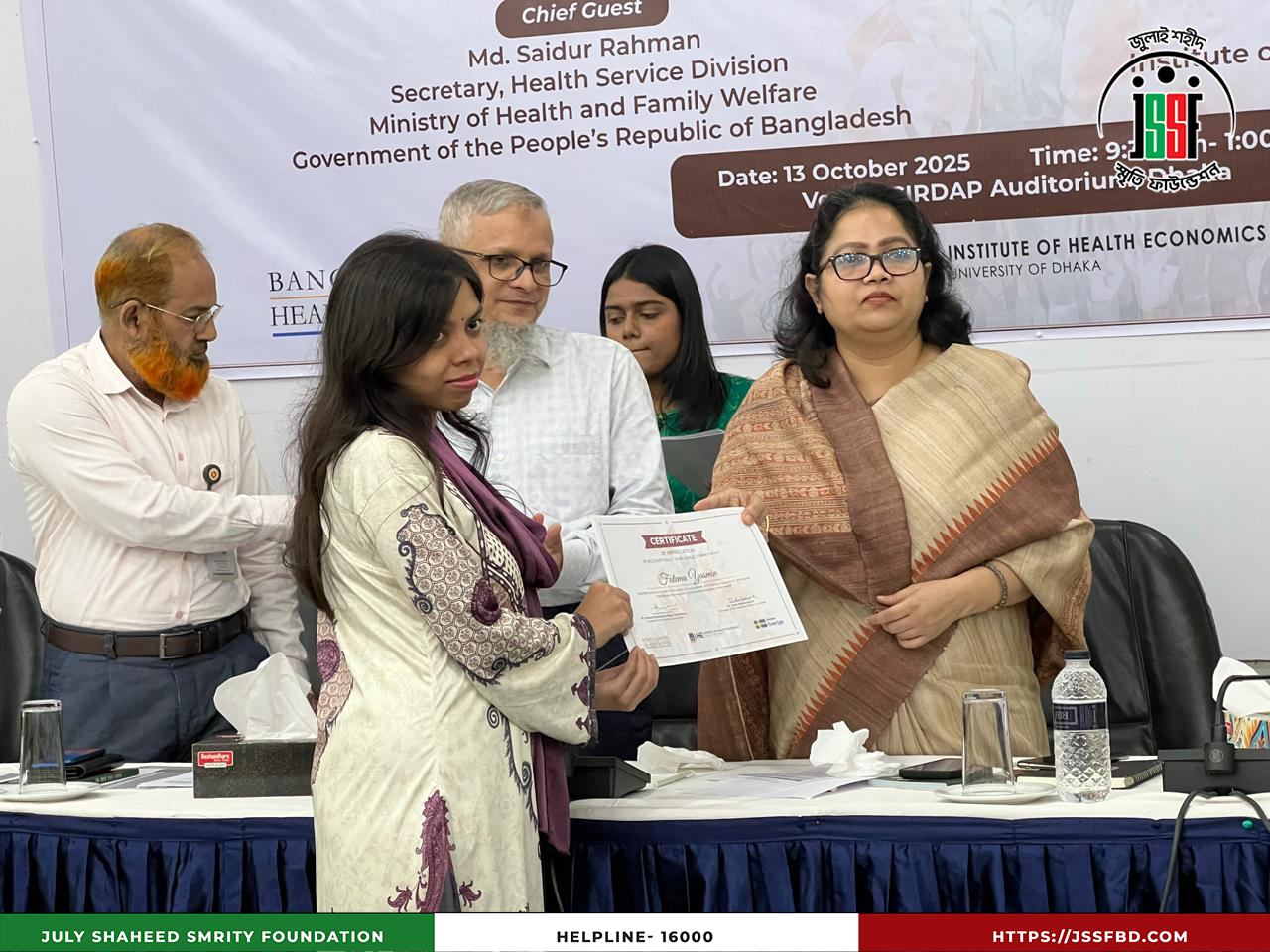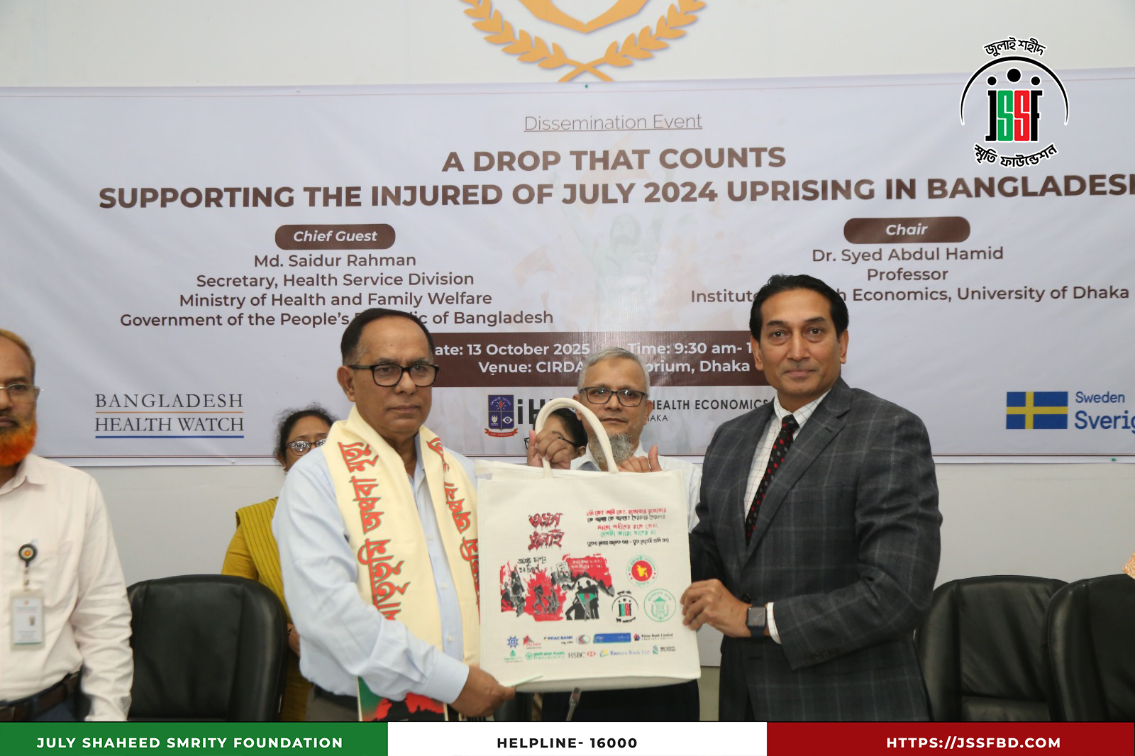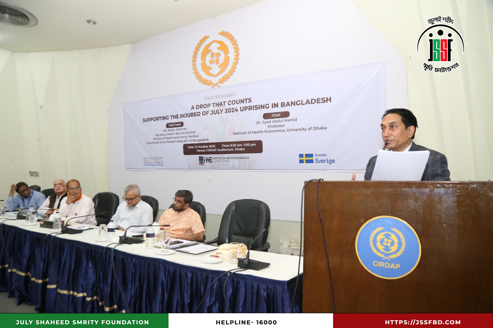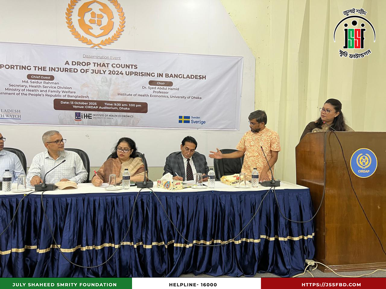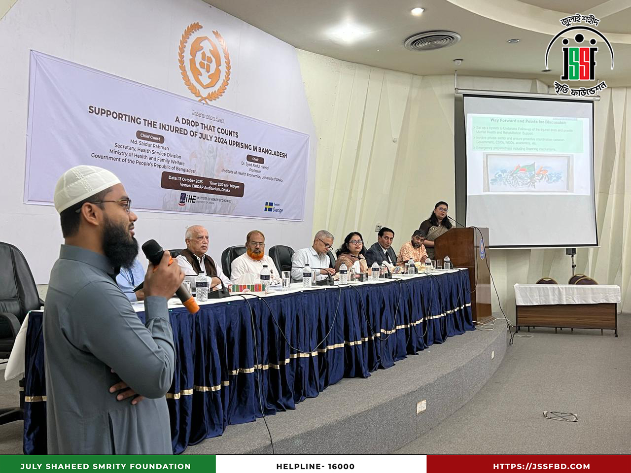 ঢাকা বিশ্ববিদ্যালয়ের ইনস্টিটিউট অব হেলথ ইকনমিক্স (IHE), বাংলাদেশ হেলথ ওয়াচ এবং সুইডিশ ইন্টারন্যাশনাল ডেভেলপমেন্ট কোঅপারেশন এজেন্সি (SIDA)-এর সহযোগিতায় ২০২৫ সালের ১৩ অক্টোবর ঢাকার সার্ডাপ অডিটোরিয়ামে “বৈষম্যবিরোধী ছাত্র আন্দোলনের আহতদের আর্থিক সহায়তা” শীর্ষক Dissemination Program অনুষ্ঠিত হয়। অনুষ্ঠানে উপস্থিত ছিলেন লেফটেন্যান্ট কর্নেল (অব.) কামাল আকবর, প্রধান নির্বাহী কর্মকর্তা এবং সামসি আরা, সাধারণ সম্পাদক, জুলাই শহীদ স্মৃতি ফাউন্ডেশনসহ বিশিষ্ট শিক্ষক ও অতিথিবৃন্দ। অংশগ্রহণকারীদের মধ্যে ছিলেন ড. সৈয়দ আবদুল হামিদ, ড. শফিউন নাহিন শিমুল, ড. আহমেদ মুশতাক রেজা চৌধুরী, ড. মোহাম্মদ আনোয়ার হোসেন, ড. মোস্তাফিজুর রহমান ও প্রফেসর ড. সায়েমা হক বিদিশা প্রমুখ। অনুষ্ঠানে জুলাই ২০২৪ সালের বৈষম্যবিরোধী ছাত্র আন্দোলনের আহতদের সহায়তা কার্যক্রমের অভিজ্ঞতা ও সাফল্য তুলে ধরা হয়, যা মানবিক সংহতি ও সামাজিক ন্যায়বিচারের প্রতি অঙ্গীকারকে আরও সুদৃঢ় করেছে।