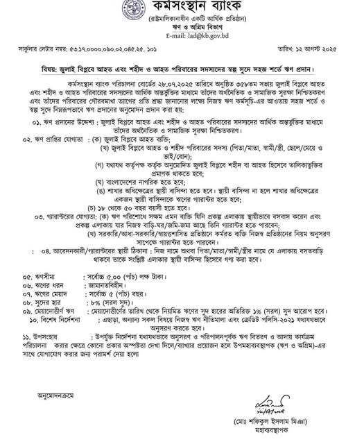 জুলাই গণঅভ্যুত্থানে আহত জুলাই যোদ্ধা ও জুলাই শহীদ পরিবারদের আর্থিক পুনর্বাসন ও সামাজিক সুরক্ষার লক্ষ্যে কর্মসংস্থান ব্যাংক বিশেষ ঋণ সুবিধা চালু করেছে।
