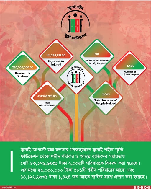 জুলাই-আগস্টে ছাত্র জনতার গণঅভ্যুত্থানে জুলাই শহীদ স্মৃতি ফাউন্ডেশন থেকে শহীদ পরিবার ও আহত ব্যক্তিদের সহায়তায় মোট ৪৩,১৭৬,৬৯৩১ টাকা ২,০০৫টি পরিবারকে বিতরণ করা হয়েছে। এর মধ্যে ২৯,০৫০,০০০ টাকা ৫৮১টি শহীদ পরিবারের মাঝে এবং ১৪,১২৬,৬৯৩১ টাকা ১,৪২৪ জন আহত ব্যক্তির মাঝে প্রদান করা হয়েছে।