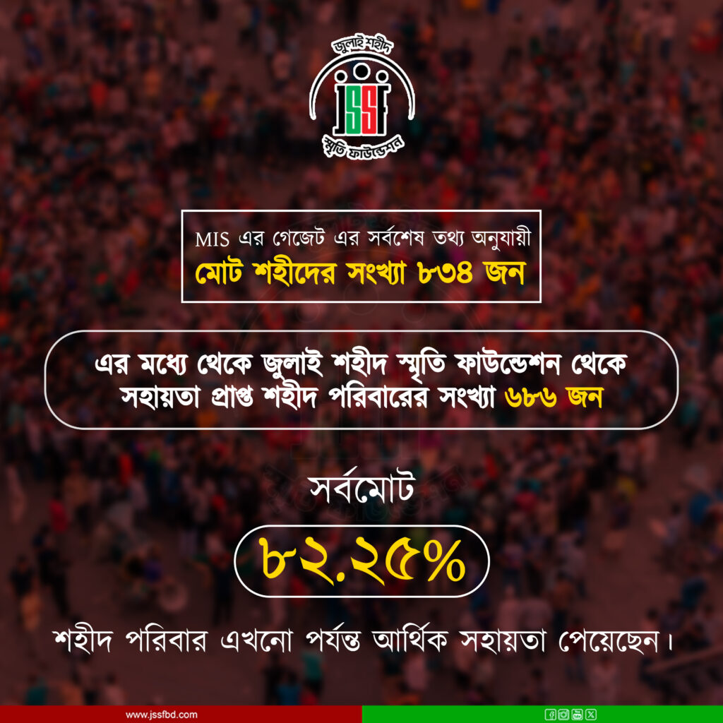 MIS এর সর্বশেষ তথ্য অনুযায়ী মোট শহীদের সংখ্যা ৮৩৪ জন। এর মধ্যে থেকে জুলাই শহীদ স্মৃতি ফাউন্ডেশন থেকে সহায়তা প্রাপ্ত শহীদ পরিবারের সংখ্যা ৬৮৬। সর্বমোট ৮২.২৫% শহীদ পরিবার এখনো পর্যন্ত আর্থিক সহায়তা পেয়েছেন।