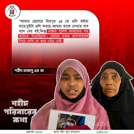 “আমার ছেলেরে মিরপুর ১৪ তে গুলি কইরা মারে, দুইটা গুলি করছে। যেই ছেলে আমার সাথে ঢাকা আসছে, তারেও জেলে ভইরা রাখছিল ১৩ দিন। হাসপাতালে নেওয়া হলে আমরা দেখতে যাব বলে বের হই, কিন্তু রাস্তায় পুলিশ আমাদের পথ আটকে দেয়। কোনো রকম হাসপাতালে গিয়ে দেখি—সে আর বেঁচে নাই।”
