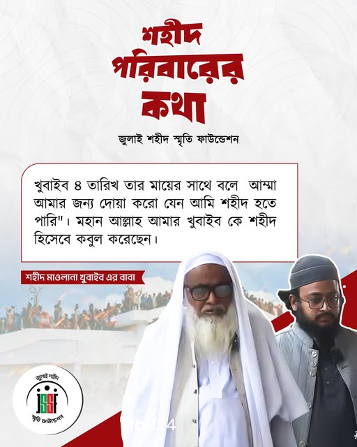 “৪ তারিখ সকালে খুবাইব তার মাকে বলে, ‘আমি আন্দোলনে যাচ্ছি, দোয়া করো যাতে আমি শহীদ হতে পারি।’ আল্লাহ আমার খুবাইবকে শহীদ হিসেবে কবুল করেছেন।”