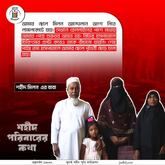 “আমার ছেলে মিলন আন্দোলনে অংশ নিতে লালবাগে যায়। সেখানে রেললাইনের পাশে মাথায় আঘাত পেয়ে গুরুতর আহত হয়। বিভিন্ন হাসপাতালে চিকিৎসার চেষ্টা করেও তাকে বাঁচানো যায়নি। শেষ পর্যন্ত তমা হাসপাতালেই আমার ছেলে পৃথিবী ছেড়ে চলে যায়।”