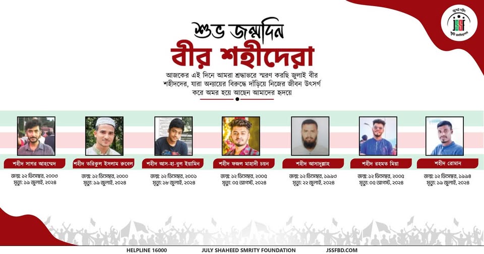 Today, December 12, we pay our deepest respect and heartfelt tribute to Martyrs Sagor Ahmed, Tarekul Islam Rubel, As-ha-bul Yamin, Fazal Mahadi Chayon, Asadullah, Rahmat Mia, and Roman on their birthdays.
