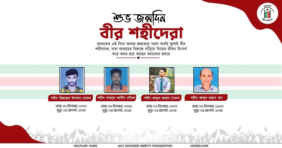 Today, December 31, we pay our deepest respect and heartfelt tribute to Shaheed Jinnatul Islam Khokon, Shaheed Shardul Ashish Sourov, Shaheed Abdul Ahad Shoikot, and Shaheed Abdul Hannan Khan on their birthday. Their unwavering sacrifice, indomitable courage, and love for the nation remain an eternal source of inspiration for us. Their ideals will continue to light our path forever.