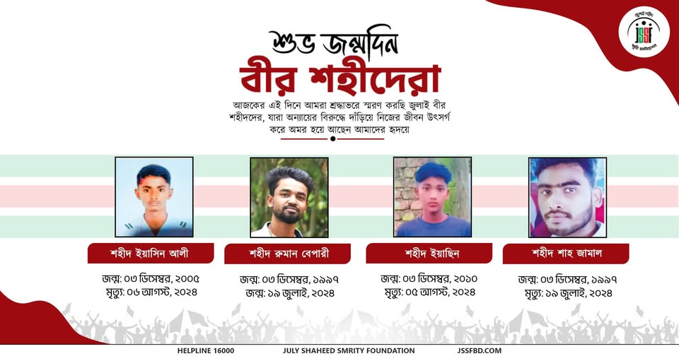 Today, 3rd December, we remember with deep respect and affection Shaheed Yasin Ali, Shaheed Ruman Bepari, Shaheed Yasin and Shaheed Shah Jamal on their birthday. Their unwavering sacrifice, courage, and ideals continue to guide and inspire us. Eternal respect to them.