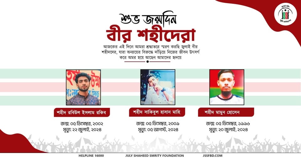 Today, 5th December, we remember with deep respect and affection Shaheed Robiul Islam Rokib, Shaheed Sakibul Hasan Mahi, and Shaheed Mamun Hossen on their birthday.