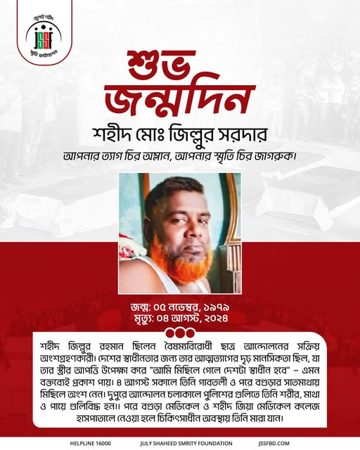 Today, we honor and remember Shaheed Zillur Rahman, a brave participant in the anti-discrimination student movement. His unwavering dedication to justice and freedom shone through his powerful words — “If I join the procession, the country will be free.” On August 4, he joined rallies in Gabtoli and later in Bogura’s Satmatha, where he was shot by police and later succumbed to his injuries at the hospital. On his birthday, we pay our deepest respects to his supreme sacrifice — the sacrifice that wrote a chapter of freedom with his own blood. Happy Birthday, Shaheed Zillur Rahman — your courage and ideals will forever inspire our fight for justice.
