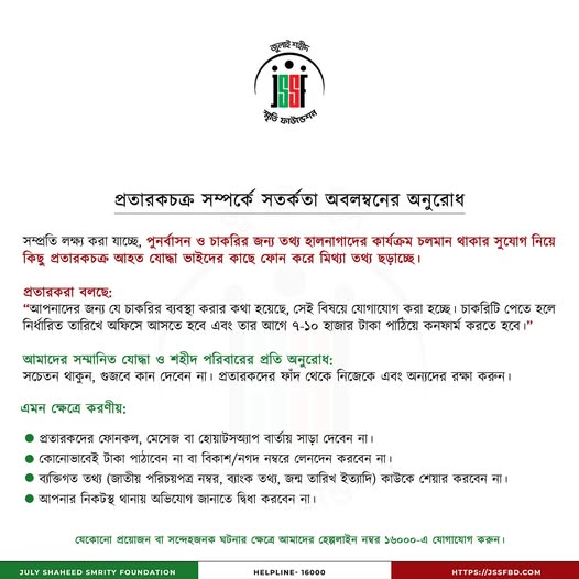জুলাই শহীদ স্মৃতি ফাউন্ডেশন এই ধরনের প্রতারণার সঙ্গে জড়িত নয়।