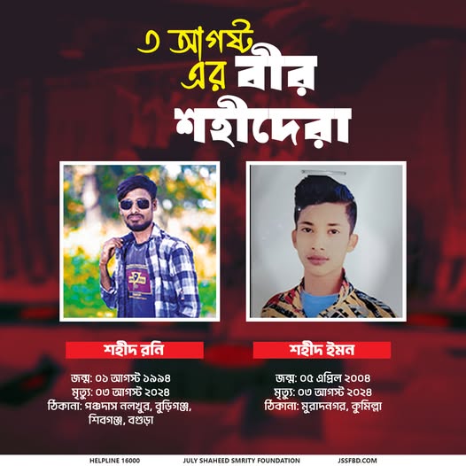 তারা থেমে যায়, কিন্তু দেশের মানুষ আরও দৃঢ় হয়। ৩ আগস্ট সেই দিন, যখন দু’টি জীবন নিভে গিয়েছিল, কিন্তু জ্বেলে দিয়েছিল হাজারো প্রাণের প্রতিরোধ। রনি আর ইমন ছিলেন কেবল নাম নয়—তারা ছিল এক প্রশ্ন: “আর কত?” তাদের চোখের শেষ আলোকছটা আজও আলো দেয় আমাদের মিছিলের পথে। যখন রাষ্ট্র মুখ ফিরিয়ে নেয়, তখনই জেগে ওঠে এমন মুখ—যারা নিজের রক্তে লিখে যায় অন্যায়ের বিরুদ্ধে মানুষের অধিকারের ইতিহাস। তারা আজ আমাদের মাঝে নেই, কিন্তু তাঁদের ডাক এখনো বাতাসে বাজে—ন্যায়ের জন্য, মানুষের জন্য।