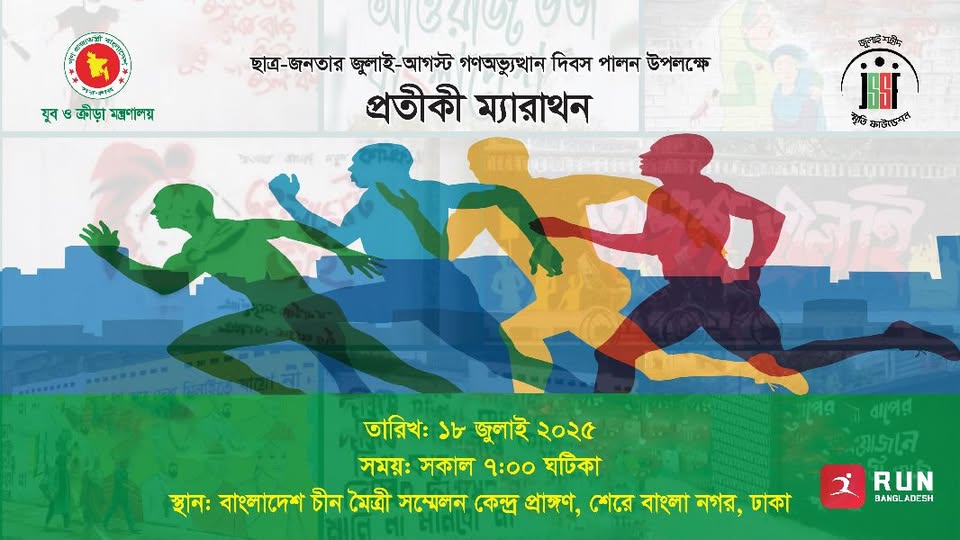 🗓 তারিখ: শুক্রবার, ১৮ জুলাই ২০২৫ / ৩ শ্রাবণ ১৪৩২ 🕖 সময়: সকাল ৭:০০টা 📍 স্থান: শেরে বাংলা নগর পুরাতন বাণিজ্য মেলা মাঠ প্রাঙ্গণ, ঢাকা যুব ও ক্রীড়া মন্ত্রণালয় এবং স্থানীয় সরকার, পল্লী উন্নয়ন ও সমবায় মন্ত্রণালয়ের মাননীয় উপদেষ্টা জনাব আসিফ মাহমুদ সজীব ভূঁইয়া মহোদয় অনুষ্ঠানে উপস্থিত থাকার সদয় সম্মতি জ্ঞাপন করেছেন। উল্লেখযোগ্যভাবে, উক্ত ম্যারাথনের অগ্রভাগে জুলাই আন্দোলনে আহত যোদ্ধা এবং শহীদ পরিবারের সদস্যবৃন্দ অংশগ্রহণ করবেন। 🔗 রেজিস্ট্রেশন তথ্যঃ