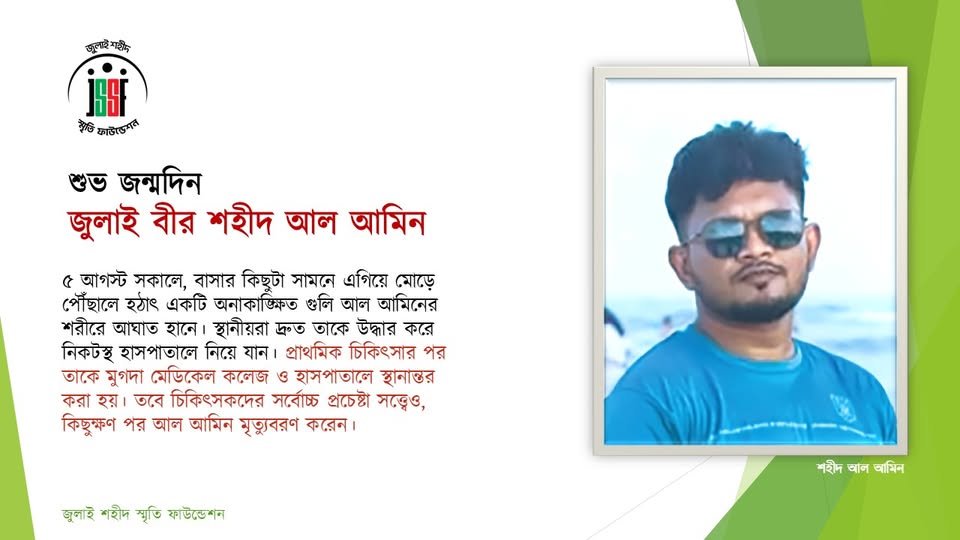 On the morning of August 5, a sudden bullet struck him near his home, taking his life soon after.His untimely death left his family, friends, and well-wishers in deep grief. On his birthday, we remember July Hero Shaheed Al Amin with profound respect and love — a soul who may have fallen to injustice but lives on forever in our hearts.