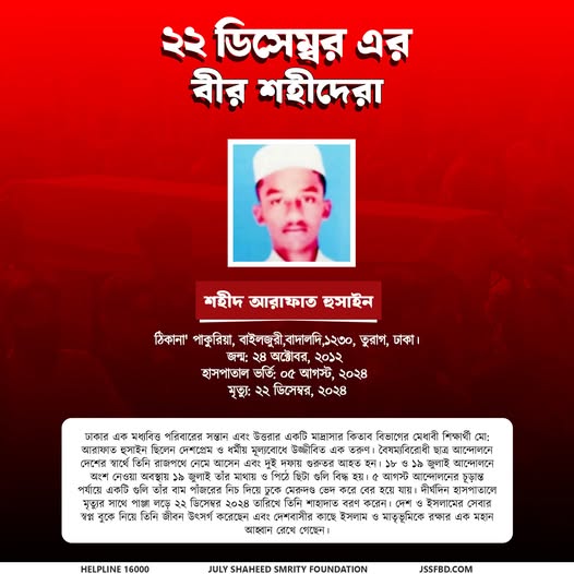 স্বাধীন দেশের স্বপ্ন বুকে নিয়ে অন্যায়ের বিরুদ্ধে রাজপথে নেমে জীবন উৎসর্গ করা এক নির্ভীক তরুণ শহীদ মোঃ আরাফাত হুসাইন। তার শাহাদাত আমাদের ন্যায়, মানবিকতা ও দেশপ্রেমের পথে অবিচল থাকার আহ্বান।