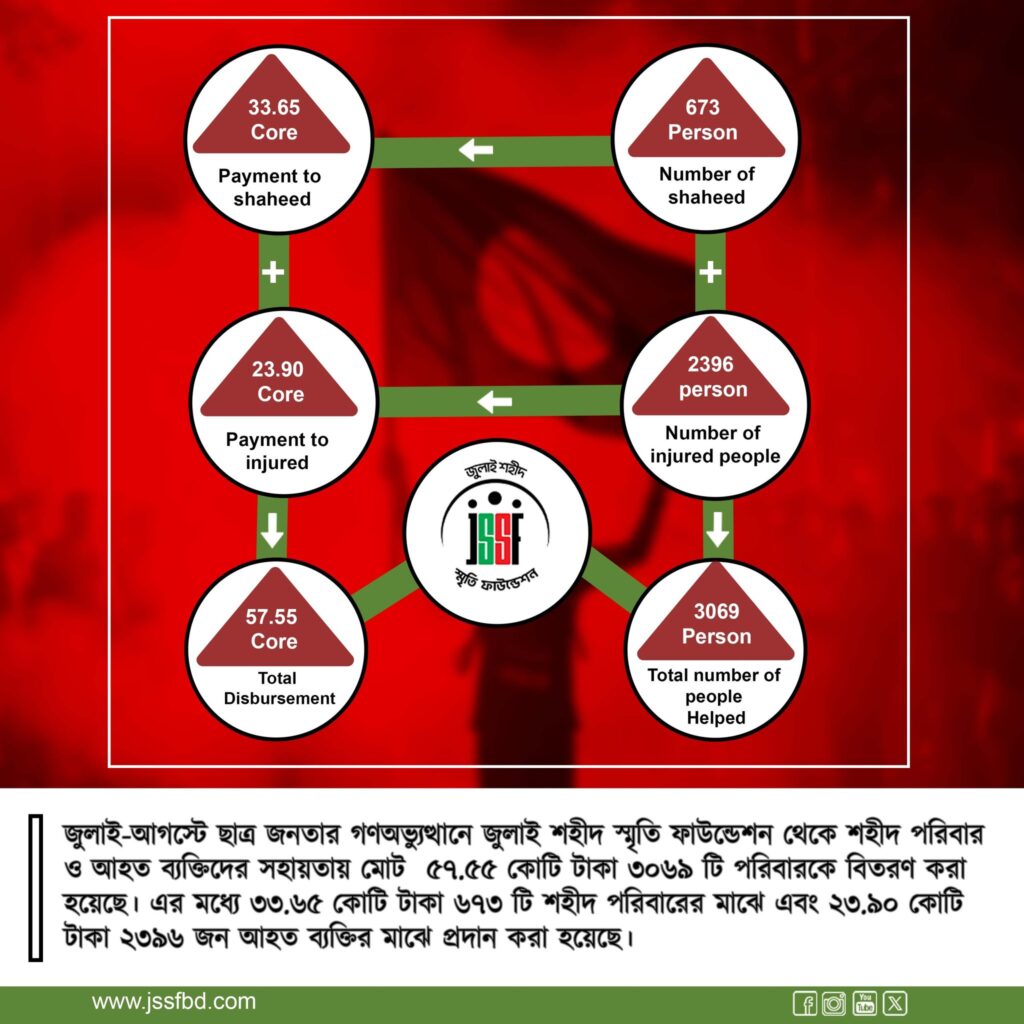 As of yesterday, the July Shaheed Smrity Foundation has successfully delivered financial aid totaling 2,41,38,685 BDT to 245 injured people, which include Tk 1,96,16,900 thorugh Bkash payment & Tk 45,21,785 through Bank Cheque. The financial support has been provided to 22 people in CMH, 17 people in BSMMU, 5 people in National Trauma Center, 27 people in CRP Bangladesh, 1 person in NITOR and 143 people in different hospitals. While a transparent verification process might take a bit longer, we are working diligently to ensure that financial assistance reaches all injured fighters as soon as possible. To avoid any discrepancies, we are focused on maintaining integrity in the verification process to honor the fighters of our ‘24 Movement. Furthermore, we are looking forward to begin supporting the first phase of 200 martyr families through our foundation.