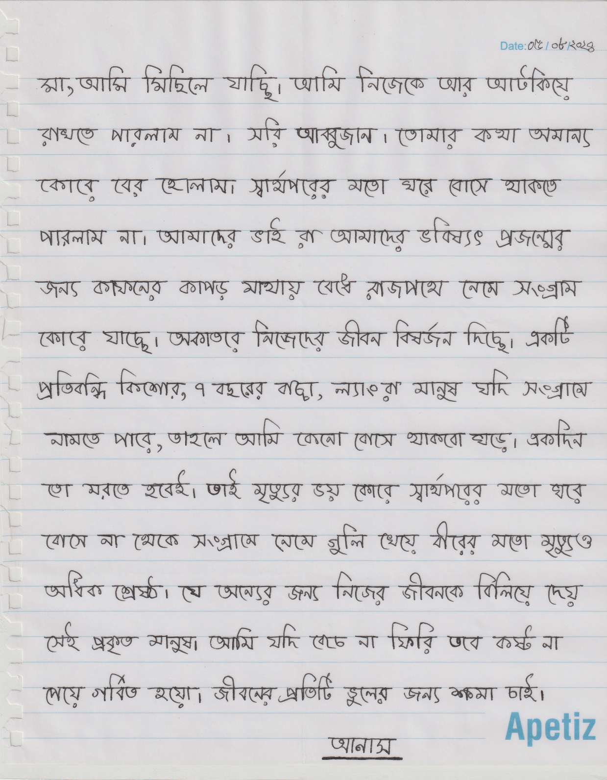 ‘’মা, আমি মিছিলে যাচ্ছি। আমি নিজেকে আর আটকিয়ে রাখতে পারলাম না। সরি আব্বুজান। তোমার কথা অমান্য কোরে বের হোলাম। স্বার্থপরের মতো ঘরে বোসে থাকতে পারলাম না। আমাদের ভাই রা আমাদের ভবিষ্যৎ প্রজন্মের জন্য কাফনের কাপড় মাথায় বেঁধে রাজপথে নেমে সংগ্রাম কোরে যাচ্ছে। অকাতরে নিজেদের জীবন বিষর্জন দিচ্ছে। একটি প্রতিবন্ধি কিশোর, ৭ বছরের বাচ্চা, ল্যাংরা মানুষ যদি সংগ্রামে নামতে পারে, তাহলে আমি কেন বোসে থাকবো ঘরে। একদিন তো মরতেই হবে। তাই মৃত্যুর ভয় কোরে স্বার্থপরের মতো ঘরে বোসে না থেকে সংগ্রামে নেমে গুলি খেয়ে বীরের মৃত্যুও অধিক শ্রেষ্ঠ। যে অন্যের জন্য নিজের জীবনকে বিলিয়ে দেয় সেই প্রকৃত মানুষ। আমি যদি বেঁচে না ফিরি তবে কষ্ট না পেয়ে গর্বিত হয়ো। জীবনে প্রতিটি ভুলের জন্য ক্ষমা চাই’’। -আনাস