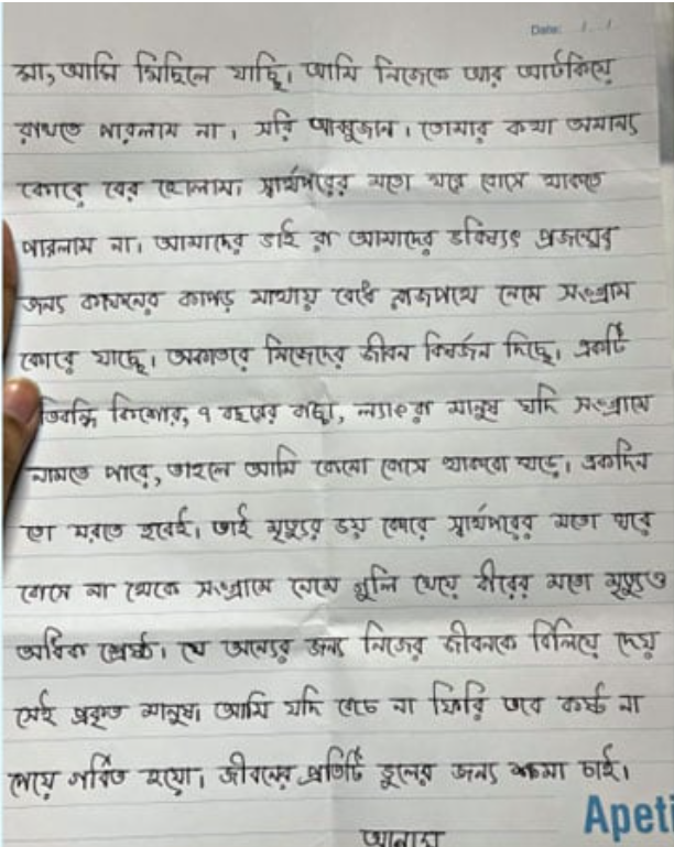 ‘’মা, আমি মিছিলে যাচ্ছি। আমি নিজেকে আর আটকিয়ে রাখতে পারলাম না। সরি আব্বুজান। তোমার কথা অমান্য কোরে বের হোলাম। স্বার্থপরের মতো ঘরে বোসে থাকতে পারলাম না। আমাদের ভাই রা আমাদের ভবিষ্যৎ প্রজন্মের জন্য কাফনের কাপড় মাথায় বেঁধে রাজপথে নেমে সংগ্রাম কোরে যাচ্ছে। অকাতরে নিজেদের জীবন বিষর্জন দিচ্ছে। একটি প্রতিবন্ধি কিশোর, ৭ বছরের বাচ্চা, ল্যাংরা মানুষ যদি সংগ্রামে নামতে পারে, তাহলে আমি কেন বোসে থাকবো ঘরে। একদিন তো মরতেই হবে। তাই মৃত্যুর ভয় কোরে স্বার্থপরের মতো ঘরে বোসে না থেকে সংগ্রামে নেমে গুলি খেয়ে বীরের মৃত্যুও অধিক শ্রেষ্ঠ। যে অন্যের জন্য নিজের জীবনকে বিলিয়ে দেয় সেই প্রকৃত মানুষ। আমি যদি বেঁচে না ফিরি তবে কষ্ট না পেয়ে গর্বিত হয়ো। জীবনে প্রতিটি ভুলের জন্য ক্ষমা চাই’’। -আনাস