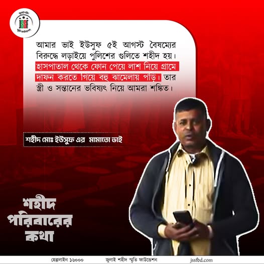 “আমার ভাই ইউসুফ ৫ই আগস্ট দেশের বৈষম্যের বিরুদ্ধে লড়াইয়ে পুলিশের গুলিতে শহীদ হয়। হাসপাতাল থেকে ফোন পাওয়ার পর আমরা লাশ নিয়ে গ্রামে দাফন করতে গেলেও তখন অনেক বাধা ও ঝামেলার মুখে পড়তে হয়। ইউসুফের স্ত্রী ও সন্তানদের ভবিষ্যৎ এখন অনিশ্চিত। আমরা শুধু প্রার্থনা করি—তার সন্তানরা যেন একদিন তাদের বাবার মতো সাহসী ও ন্যায়ের পক্ষে দাঁড়ানো মানুষ হয়ে উঠতে পারে।”